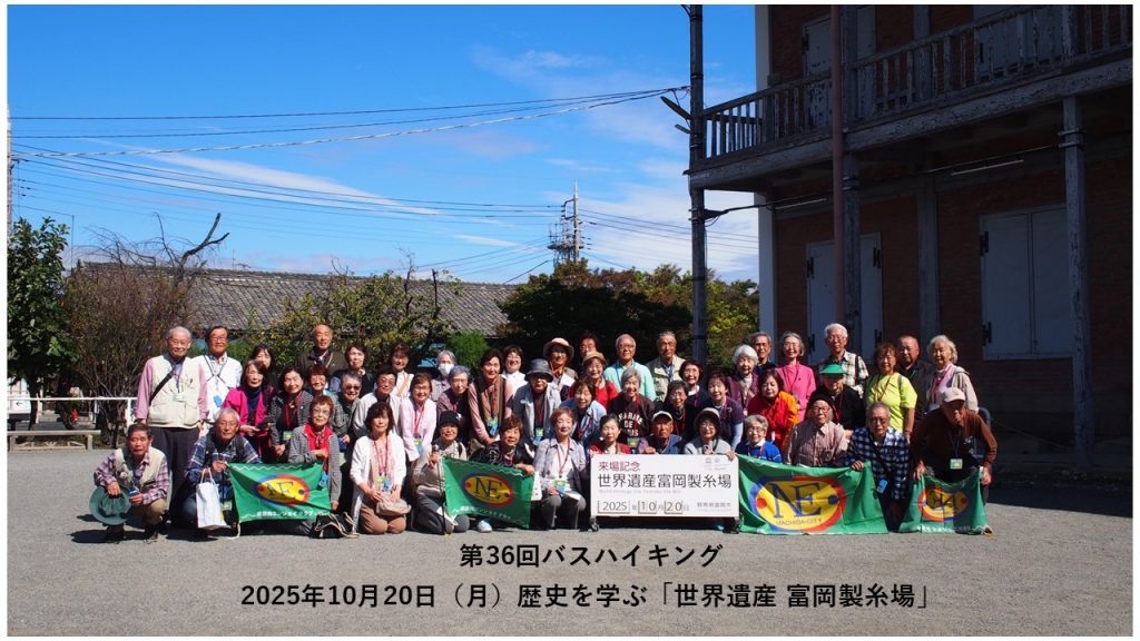過去のバスハイク行先:「奥多摩丹波渓谷」「八ヶ岳天女山」「西沢渓谷」「金冠山と修善寺」「湯の丸高原」「榛名山と伊香保温泉」「富士五湖紅陽台」「上高地」「碓氷峠」「美ヶ原高原」「昇仙峡」「城ヶ崎海岸」「白駒の池」「馬籠宿」「戦場ヶ原と日光」「浜名湖」「善光寺」「笠間焼陶芸教室」「接阻峡」「浅間高原」「清里」「西湖青木ヶ原樹海」「中山城跡と三島」「秩父長瀞」「日本平」「修善寺・浄蓮の滝」「養老渓谷」「身延山」 「勝沼ぶどうの郷めぐり」「世界遺産 富岡製糸場」